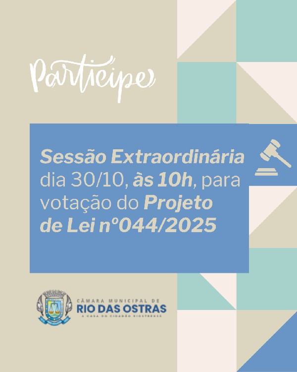 A Câmara Municipal de Rio das Ostras realiza Sessão Extraordinária no dia 30 de outubro, às 10h, para a votação do Projeto de Lei nº 044/2025. Acompanhe e participe!